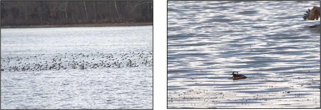 On Wed 1/18, the Wilsons, Steve Fitzsimmons, Bill McDaniel, Allison Orsi and I made a tour around Swarts wood Lake. From the beach at the main parking lot, we saw Canada Geese, Bufflehead, Redhead, Ring-necked Duck, Hooded Merganser, American Wigeon, Mallard, Ruddy Duck, Mute Swan, Ring-billed Gulls and an immature Bald Eagle. There was a flotilla of at least 500 Com mon Merganser on the middle of the lake.