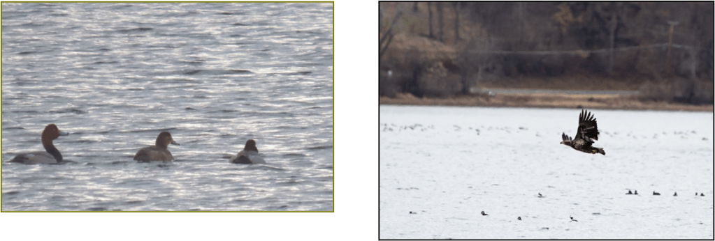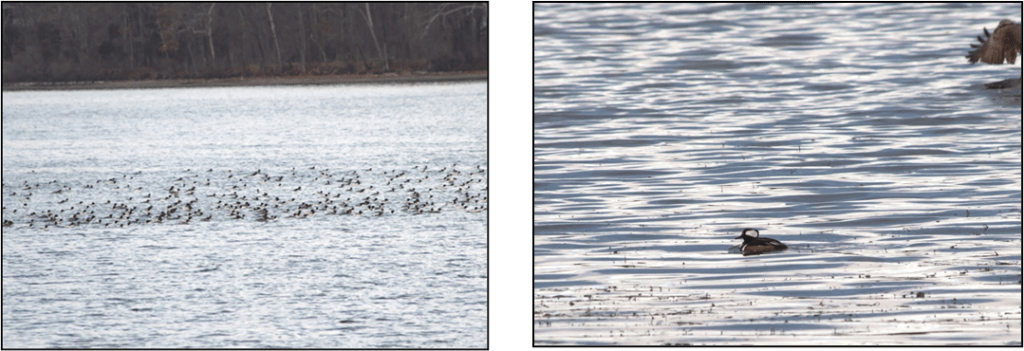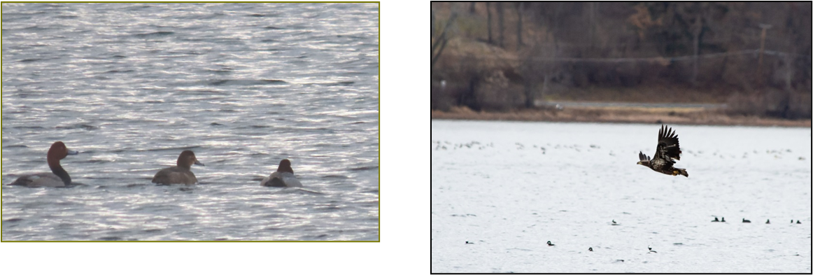 At Hendershot Point, we had more Hooded & Common Merganser, Bufflehead, Ring-necked Duck, Black Duck, Mallard, Mute Swan, American Coot, Pied-billed Grebe and another immature Bald Eagle that was darker in plum age than the first bird seen. We watched this one circle around and then come down to the water and miss its fish.