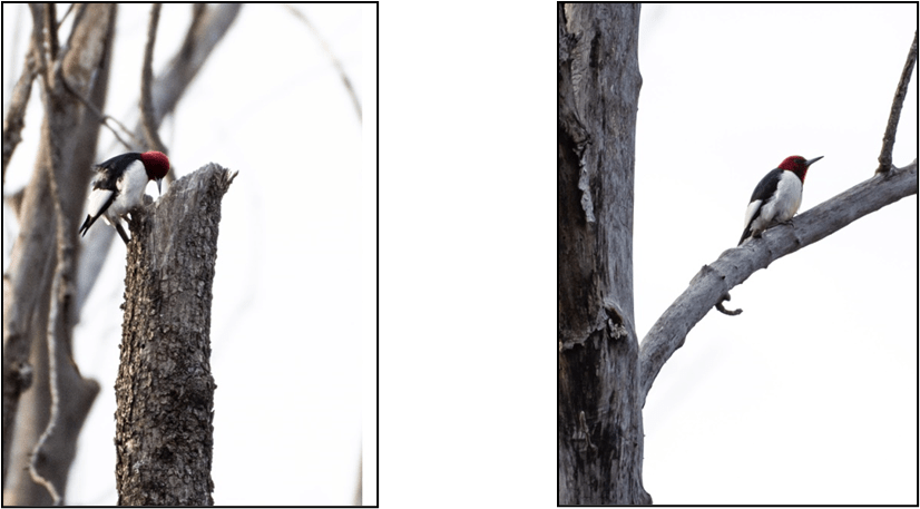 Also, after a bit I saw a Flicker also at a distance but identifiable zoomed in. Then I saw a bird fly a bit closer to me, thought it was the Flicker still, but it was a Red-headed Woodpecker! It wasn’t too far away, but then after waiting a few more minutes, it flew closer. Still pretty high in a naked/dead tree on the shore, but I got some photos.