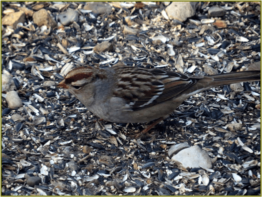 1/5 an immature White-crowned Sparrow was under the feeder for a short while, we usually don’t see them in the winter here. Last week we had about 5 Eastern Bluebirds chasing around in the trees at the end of the driveway.