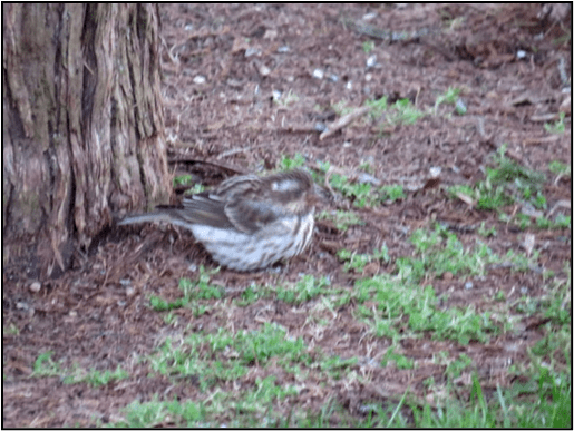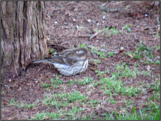 Today, 11/20 at just about dusk, I noticed a female Purple Finch at the base of the Cedar tree in the front yard. There is a suet feeder in that tree so either she picked up something that had fallen from it or was eating some other kind of seed. We have been inundated with Black-capped Chickadees with visual sighting of at least six individuals but there probably are more. We also have at least 4 White breasted Nuthatches and 5 Tufted Titmice. As for the American Goldfinches their numbers fluctuate from one or two to a feeder filled with them. We also have increasing numbers of White throated Sparrows but as for Dark-eyed Juncos we will see 2 or 3 one day and then none for several days.