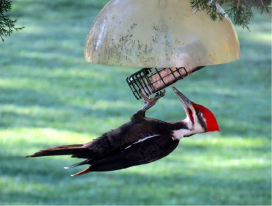 This past week the first of the year Chipping Sparrows showed up in the yard, first heard and then seen. We have had visits by small flocks of male Red-winged Blackbirds, Brown-headed Cowbirds and Common Grackles. Both male and female Purple Finches have been visiting the sunflower and peanut feeders. On the 14th while putting the feeders out I heard an Eastern Towhee quietly calling “your tea” and then later in the afternoon a Brown Thrasher was under the feeder. Although we have had Pileated Woodpeckers in the yard, they have never come to the suet feeder. I had assumed because we have it hanging facing the ground under a dome. On Friday (4/12) Don spotted a male in the Dogwood tree, then it flew over to the Cedar tree where the suet feeder hangs and then it was on the feeder hanging from it. We could see it getting big chunks and eating the seed that is in it. It has come back each day since then and calling out before arriving to the tree. The Downy and Red-bellied Woodpeckers have once again been using the gutters for their sounding boards. If we don’t get either the peanut or suet feeders out in the morning then the Red-bellied really drums away. It is amazing how that vibrates throughout the house.